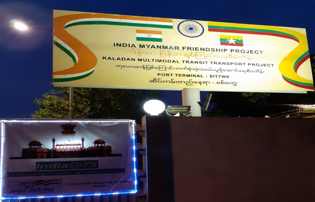 The illumination of Kaladan Multimodal Transit Transport Project (KMTTP), Sittwe port premises was organized as part of India@75 (Azadi Ka Amrut Mahotsav) event on 15th August 2021 by Consulate General of India, Sittwe in Myanmar. All the Officials of CGI,Sittwe and KMTTP Port participated in the event.